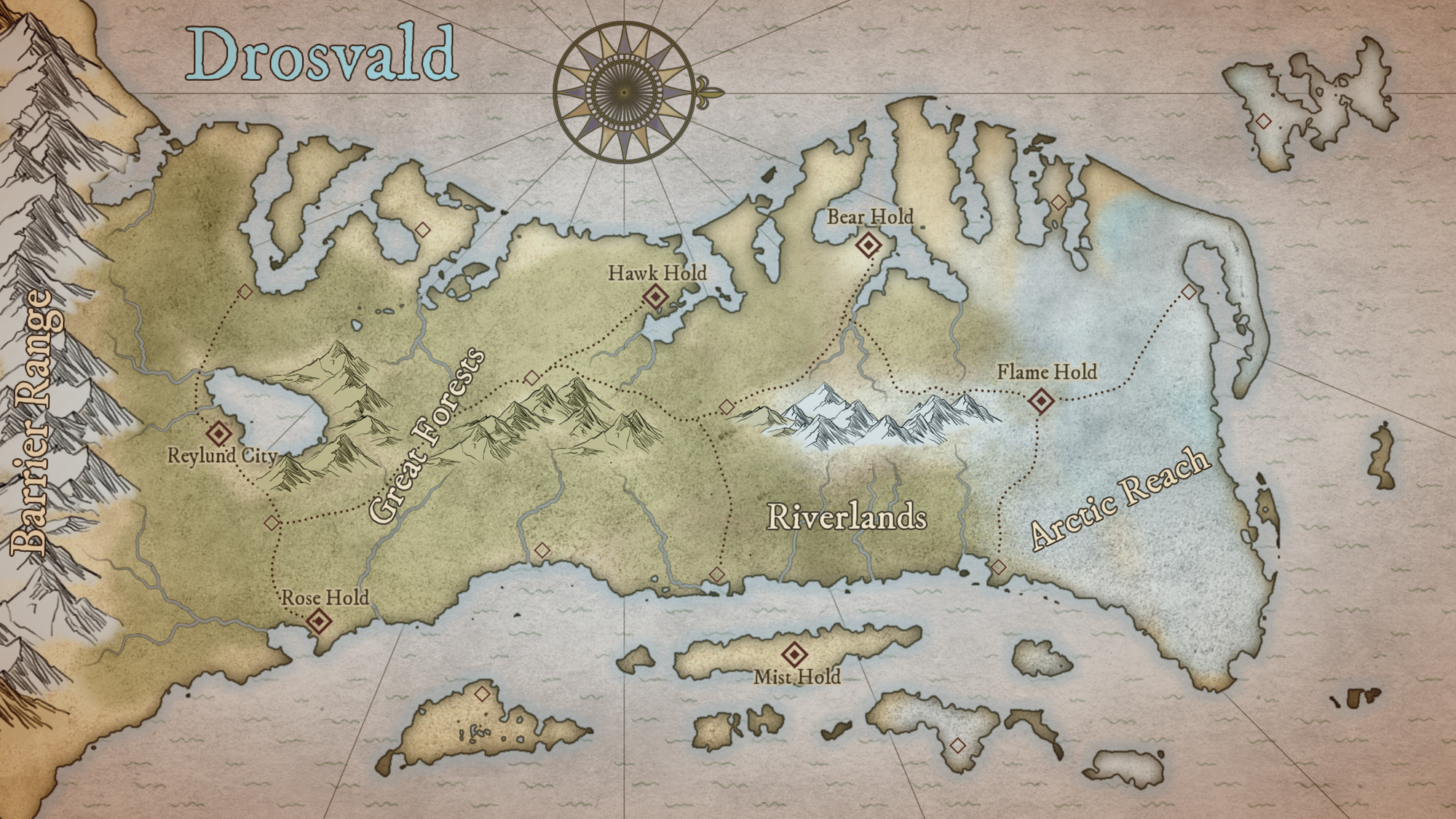 Drosvald is the name of the region this game is set in. It's a peninsula, reaching into the cold north seas, consisting of a series of Holds - frontier settlements, none over a century old, built by refugees escaping a war to the south. The region is mostly wild and untamed, though there are ruins to be found in the mountains, remnants of an older civilisation that was destroyed centuries before in the Firefall - an apocalyptic event that not much is known about. The region was largely uninhabited for centuries after, until the refugees crossed the Barrier Mountains searching for a new life.